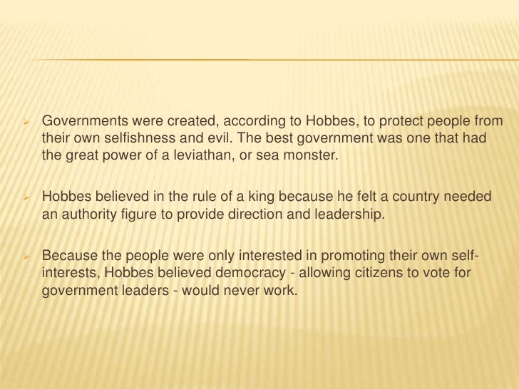 4. 4.  Governments were created, according to Hobbes, to protect people from their own selfishness and evil. The best government was one that had the great power of a leviathan, or sea monster. Hobbes believed in the rule of a king because he felt a country needed an authority figure to provide direction and leadership. Because the people were only interested in promoting their own self- interests, Hobbes believed democracy - allowing citizens to vote for government leaders - would never work.