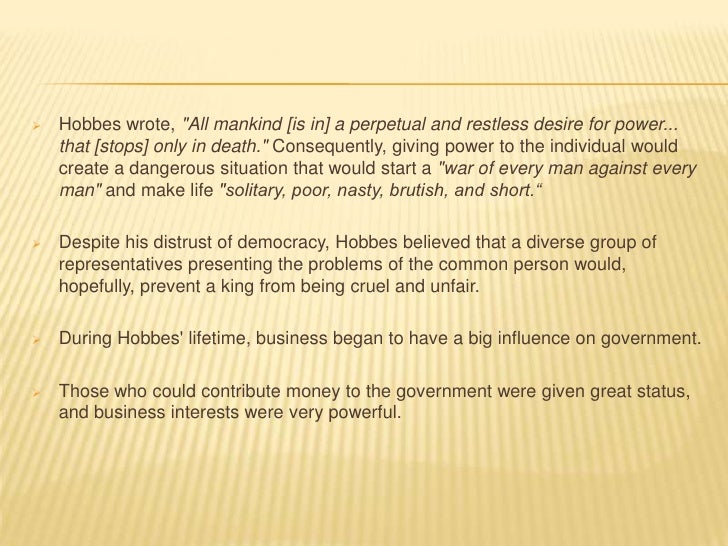 6. 6.  Hobbes wrote, "All mankind [is in] a perpetual and restless desire for power... that [stops] only in death." Consequently, giving power to the individual would create a dangerous situation that would start a "war of every man against every man" and make life "solitary, poor, nasty, brutish, and short.“ Despite his distrust of democracy, Hobbes believed that a diverse group of representatives presenting the problems of the common person would, hopefully, prevent a king from being cruel and unfair. During Hobbes lifetime, business began to have a big influence on government. Those who could contribute money to the government were given great status, and business interests were very powerful.