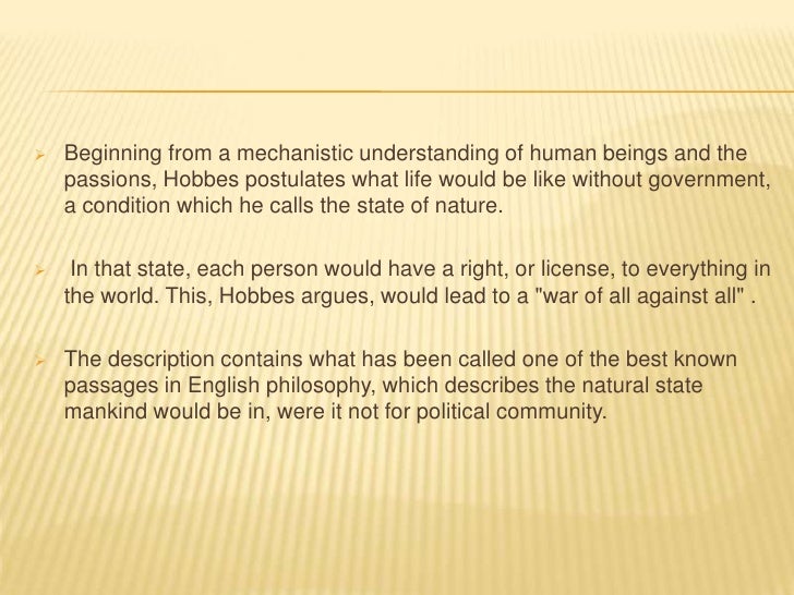 8. 8.  Beginning from a mechanistic understanding of human beings and the passions, Hobbes postulates what life would be like without government, a condition which he calls the state of nature. In that state, each person would have a right, or license, to everything in the world. This, Hobbes argues, would lead to a "war of all against all" . The description contains what has been called one of the best known passages in English philosophy, which describes the natural state mankind would be in, were it not for political community.