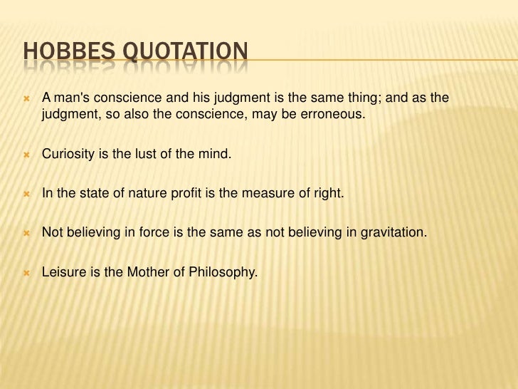 9. 9. HOBBES QUOTATION A mans conscience and his judgment is the same thing; and as the judgment, so also the conscience, may be erroneous. Curiosity is the lust of the mind. In the state of nature profit is the measure of right. Not believing in force is the same as not believing in gravitation. Leisure is the Mother of Philosophy.