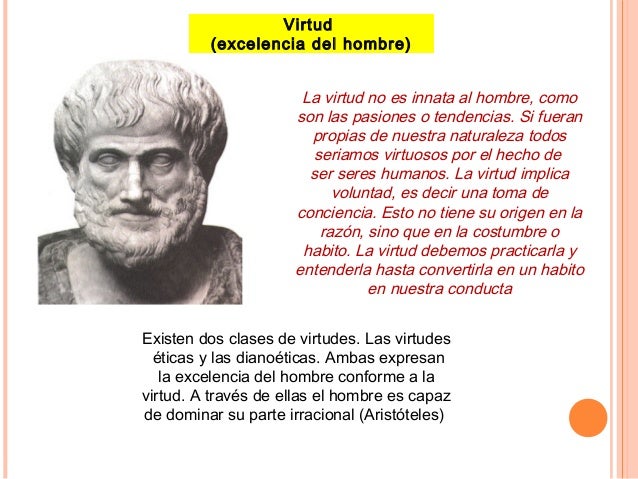 13. 13. Virtud (excelencia del hombre) La virtud no es innata al hombre, como son las pasiones o tendencias. Si fueran propias de nuestra naturaleza todos seriamos virtuosos por el hecho de ser seres humanos. La virtud implica voluntad, es decir una toma de conciencia. Esto no tiene su origen en la razón, sino que en la costumbre o habito. La virtud debemos practicarla y entenderla hasta convertirla en un habito en nuestra conducta Existen dos clases de virtudes. Las virtudes éticas y las dianoéticas. Ambas expresan la excelencia del hombre conforme a la virtud. A través de ellas el hombre es capaz de dominar su parte irracional (Aristóteles)
