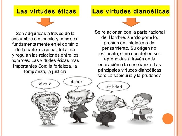 14. 14. Las virtudes éticas Son adquiridas a través de la costumbre o el habito y consisten fundamentalmente en el dominio de la parte irracional del alma y regulan las relaciones entre los hombres. Las virtudes éticas mas importantes Son: la fortaleza, la templanza, la justicia Las virtudes dianoéticas Se relacionan con la parte racional del Hombre, siendo por ello, propias del intelecto o del pensamiento. Su origen no es innato, si no que deben ser aprendidas a través de la educación o la enseñanza. Las principales virtudes dianoéticas son: La sabiduría y la prudencia debervirtud utilidad