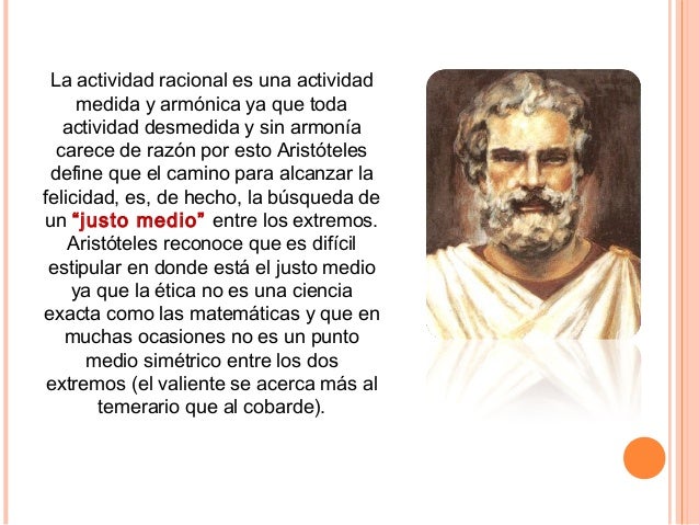 16. 16. La actividad racional es una actividad medida y armónica ya que toda actividad desmedida y sin armonía carece de razón por esto Aristóteles define que el camino para alcanzar la felicidad, es, de hecho, la búsqueda de un “justo medio” entre los extremos. Aristóteles reconoce que es difícil estipular en donde está el justo medio ya que la ética no es una ciencia exacta como las matemáticas y que en muchas ocasiones no es un punto medio simétrico entre los dos extremos (el valiente se acerca más al temerario que al cobarde).