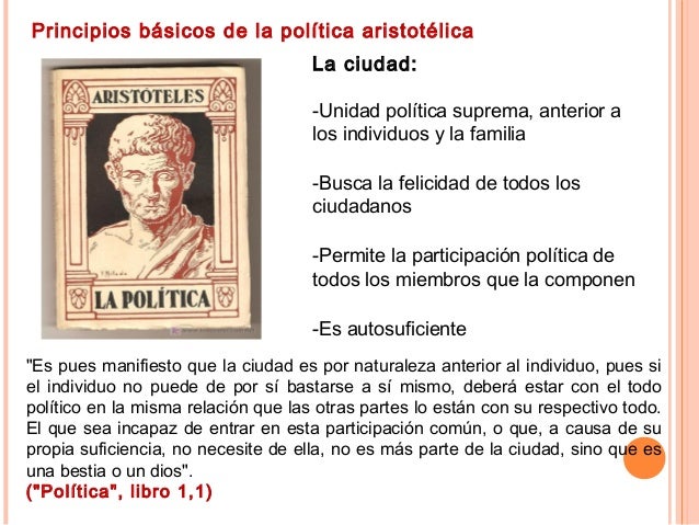 17. 17. Principios básicos de la política aristotélica "Es pues manifiesto que la ciudad es por naturaleza anterior al individuo, pues si el individuo no puede de por sí bastarse a sí mismo, deberá estar con el todo político en la misma relación que las otras partes lo están con su respectivo todo. El que sea incapaz de entrar en esta participación común, o que, a causa de su propia suficiencia, no necesite de ella, no es más parte de la ciudad, sino que es una bestia o un dios". ("Política", libro 1,1) La ciudad: -Unidad política suprema, anterior a los individuos y la familia -Busca la felicidad de todos los ciudadanos -Permite la participación política de todos los miembros que la componen -Es autosuficiente