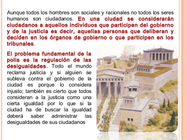 18. 18. Aunque todos los hombres son sociales y racionales no todos los seres humanos son ciudadanos. En una ciudad se considerarán ciudadanos a aquellos individuos que participen del gobierno y de la justicia es decir, aquellas personas que deliberan y deciden en los órganos de gobierno o que participen en los tribunales. El problema fundamental de la polis es la regulación de las desigualdades. Todo el mundo reclama justicia y si alguien se subleva contra el gobierno de la ciudad es porque lo considera injusto; también es cierto que todos consideran a la justicia como una cierta igualdad por lo que si la ciudad ha de buscar la igualdad deberá saber administrar las desigualdades de sus ciudadanos
