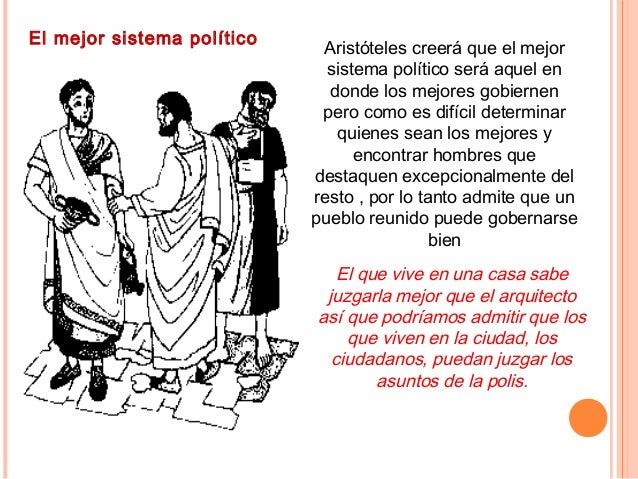 19. 19. El mejor sistema político Aristóteles creerá que el mejor sistema político será aquel en donde los mejores gobiernen pero como es difícil determinar quienes sean los mejores y encontrar hombres que destaquen excepcionalmente del resto , por lo tanto admite que un pueblo reunido puede gobernarse bien El que vive en una casa sabe juzgarla mejor que el arquitecto así que podríamos admitir que los que viven en la ciudad, los ciudadanos, puedan juzgar los asuntos de la polis.