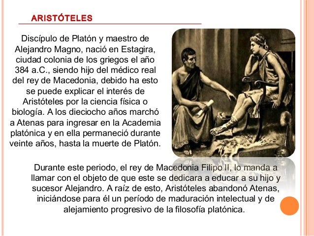 2. 2. Discípulo de Platón y maestro de Alejandro Magno, nació en Estagira, ciudad colonia de los griegos el año 384 a.C., siendo hijo del médico real del rey de Macedonia, debido ha esto se puede explicar el interés de Aristóteles por la ciencia física o biología. A los dieciocho años marchó a Atenas para ingresar en la Academia platónica y en ella permaneció durante veinte años, hasta la muerte de Platón. Durante este periodo, el rey de Macedonia Filipo II, lo manda a llamar con el objeto de que este se dedicara a educar a su hijo y sucesor Alejandro. A raíz de esto, Aristóteles abandonó Atenas, iniciándose para él un período de maduración intelectual y de alejamiento progresivo de la filosofía platónica. ARISTÓTELES