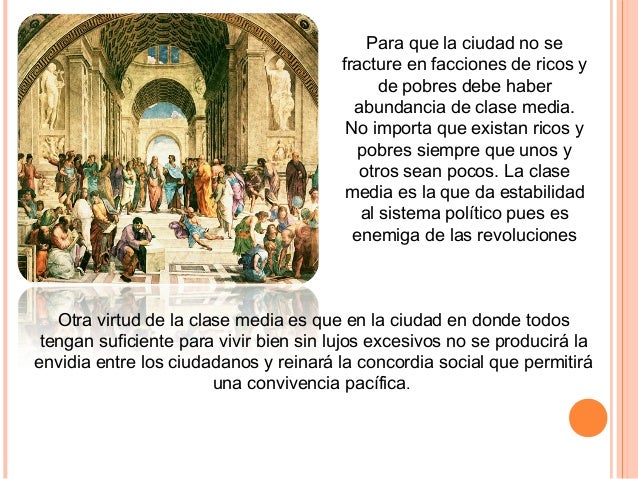 20. 20. Para que la ciudad no se fracture en facciones de ricos y de pobres debe haber abundancia de clase media. No importa que existan ricos y pobres siempre que unos y otros sean pocos. La clase media es la que da estabilidad al sistema político pues es enemiga de las revoluciones Otra virtud de la clase media es que en la ciudad en donde todos tengan suficiente para vivir bien sin lujos excesivos no se producirá la envidia entre los ciudadanos y reinará la concordia social que permitirá una convivencia pacífica.