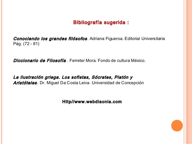 21. 21. Bibliografía sugerida : Conociendo los grandes filósofos. Adriana Figueroa. Editorial Universitaria Pág. (72 - 81) Diccionario de Filosofía . Ferreter Mora. Fondo de cultura México. Http//www.webdiaonia.com La ilustración griega. Los sofistas, Sócrates, Platón y Aristóteles. Dr. Miguel Da Costa Leiva. Universidad de Concepción
