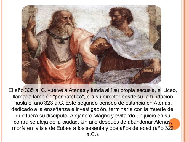 3. 3. El año 335 a. C. vuelve a Atenas y funda allí su propia escuela, el Liceo, llamada también "peripatética", era su director desde su la fundación hasta el año 323 a.C. Este segundo periodo de estancia en Atenas, dedicado a la enseñanza e investigación, terminaría con la muerte del que fuera su discípulo, Alejandro Magno y evitando un juicio en su contra se aleja de la ciudad. Un año después de abandonar Atenas, moría en la isla de Eubea a los sesenta y dos años de edad (año 322 a.C.).