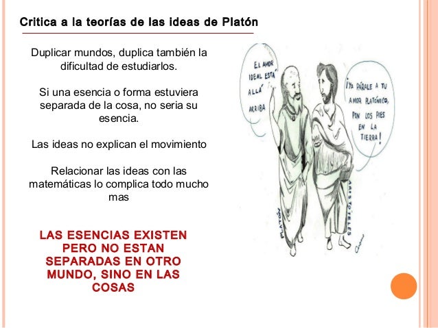 5. 5. Critica a la teorías de las ideas de Platón Duplicar mundos, duplica también la dificultad de estudiarlos. Si una esencia o forma estuviera separada de la cosa, no seria su esencia. Las ideas no explican el movimiento Relacionar las ideas con las matemáticas lo complica todo mucho mas LAS ESENCIAS EXISTEN PERO NO ESTAN SEPARADAS EN OTRO MUNDO, SINO EN LAS COSAS