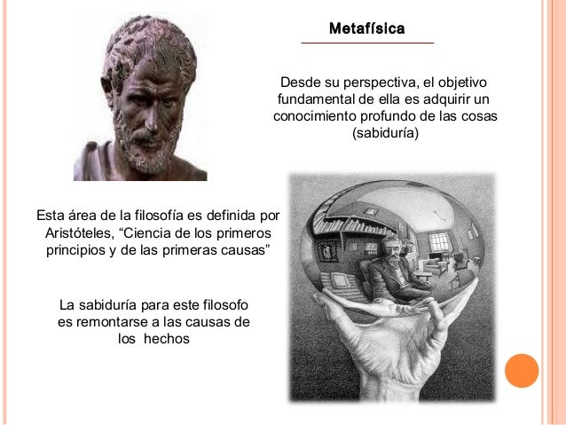 6. 6. Metafísica Desde su perspectiva, el objetivo fundamental de ella es adquirir un conocimiento profundo de las cosas (sabiduría) Esta área de la filosofía es definida por Aristóteles, “Ciencia de los primeros principios y de las primeras causas” La sabiduría para este filosofo es remontarse a las causas de los hechos