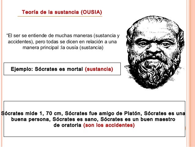 7. 7. Teoría de la sustancia (OUSIA) “El ser se entiende de muchas maneras (sustancia y accidentes), pero todas se dicen en relación a una manera principal :la ousía (sustancia) Ejemplo: Sócrates es mortal (sustancia) Sócrates mide 1, 70 cm, Sócrates fue amigo de Platón, Sócrates es una buena persona, Sócrates es sano, Sócrates es un buen maestro de oratoria (son los accidentes)