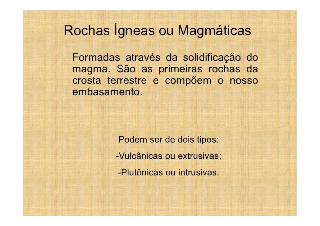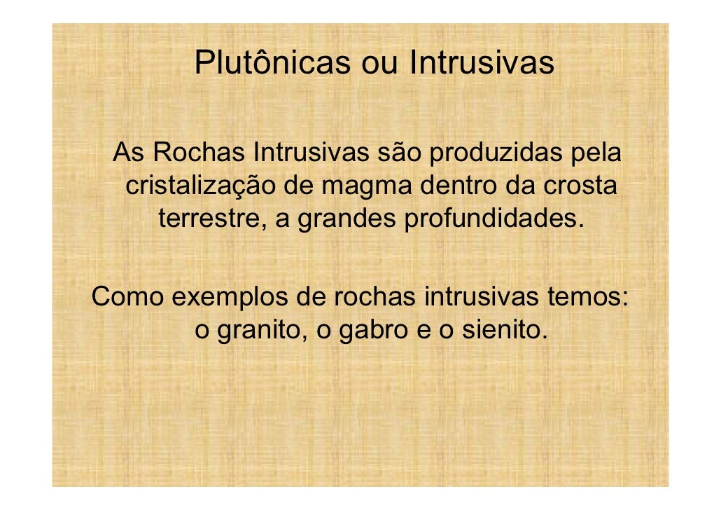 10. 10. Plutônicas ou Intrusivas As Rochas Intrusivas são produzidas pela cristalização de magma dentro da crosta terrestre, a grandes profundidades.Como exemplos de rochas intrusivas temos: o granito, o gabro e o sienito.