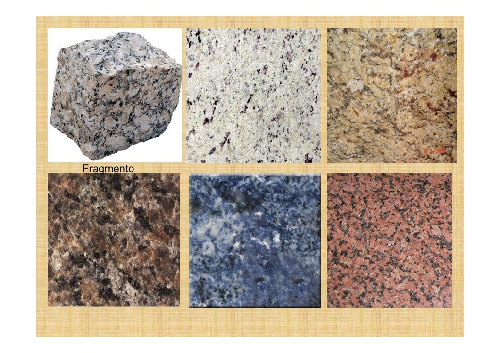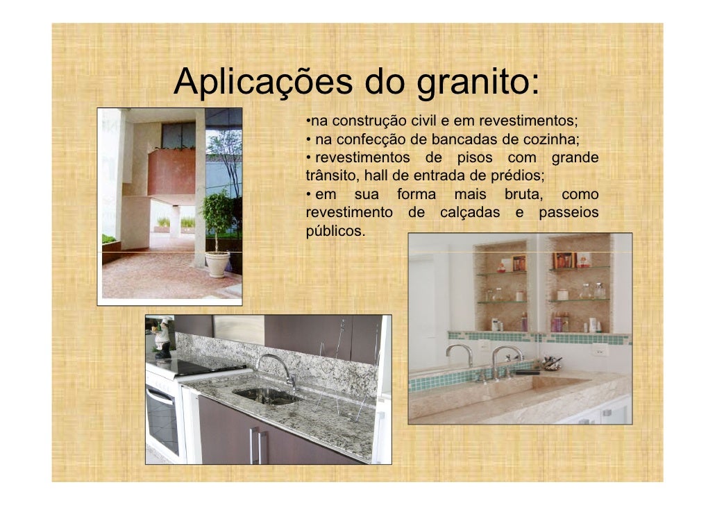 13. 13. Aplicações do granito: •na construção civil e em revestimentos; • na confecção de bancadas de cozinha; • revestimentos de pisos com grande trânsito, hall de entrada de prédios; • em sua forma mais bruta, como revestimento de calçadas e passeios públicos.