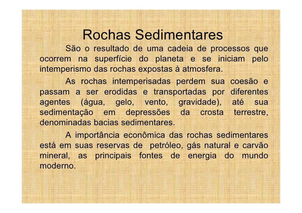 14. 14. Rochas Sedimentares São o resultado de uma cadeia de processos queocorrem na superfície do planeta e se iniciam pelointemperismo das rochas expostas à atmosfera. As rochas intemperisadas perdem sua coesão epassam a ser erodidas e transportadas por diferentesagentes (água, gelo, vento, gravidade), até suasedimentação em depressões da crosta terrestre,denominadas bacias sedimentares. A importância econômica das rochas sedimentaresestá em suas reservas de petróleo, gás natural e carvãomineral, as principais fontes de energia do mundomoderno.
