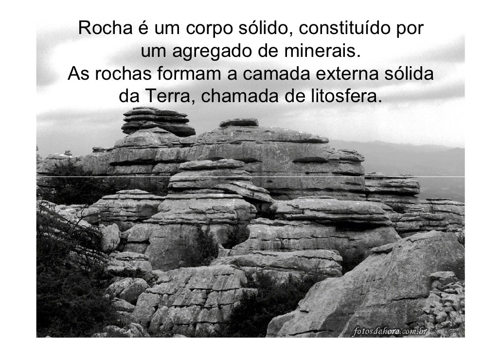 2. 2. Rocha é um corpo sólido, constituído por um agregado de minerais.As rochas formam a camada externa sólida da Terra, chamada de litosfera.