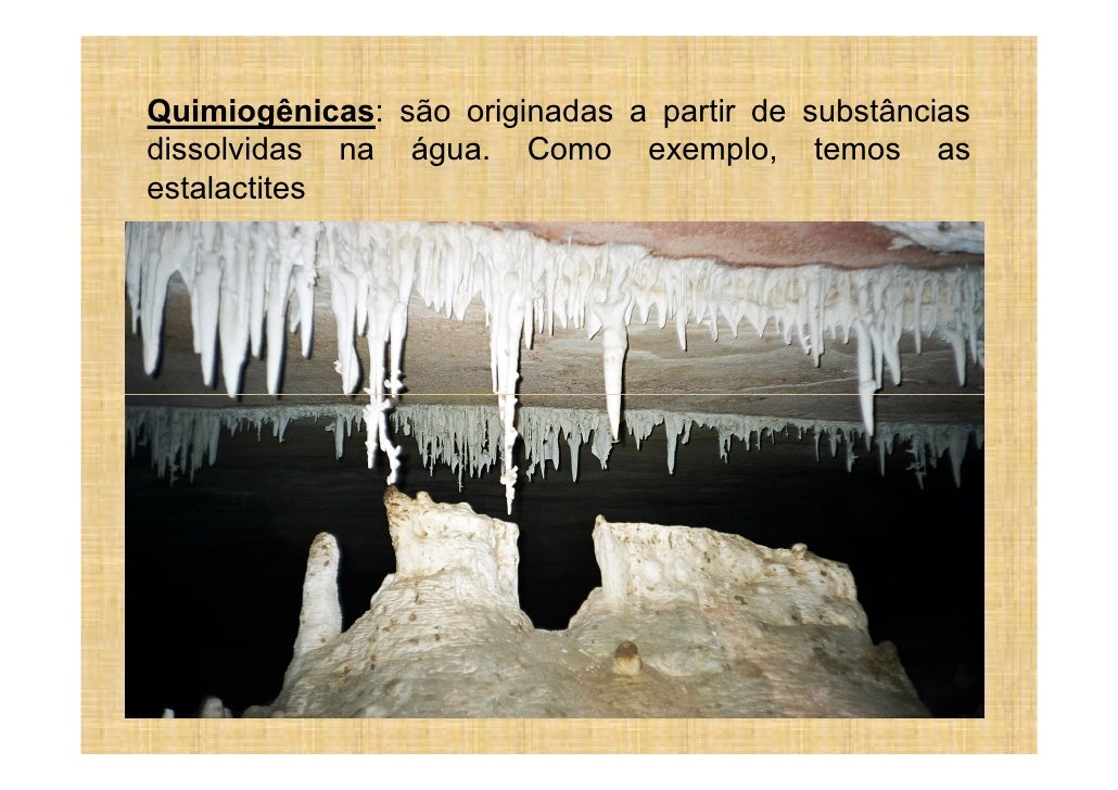 20. 20. Quimiogênicas: são originadas a partir de substânciasdissolvidas na água. Como exemplo, temos asestalactites