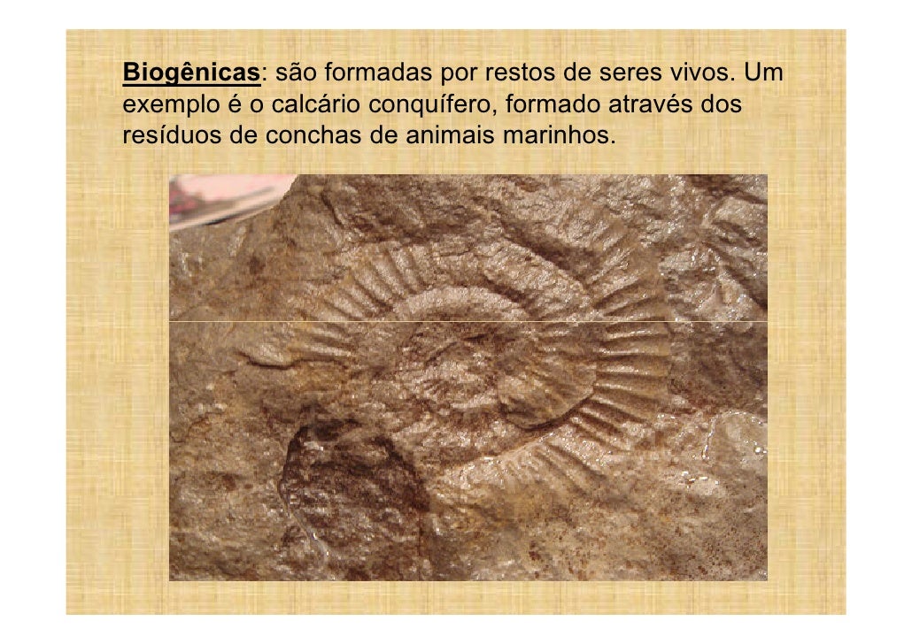 22. 22. Biogênicas: são formadas por restos de seres vivos. Umexemplo é o calcário conquífero, formado através dosresíduos de conchas de animais marinhos.
