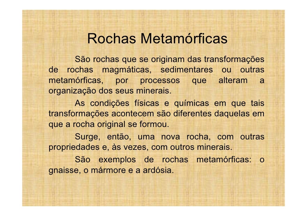 23. 23. Rochas Metamórficas São rochas que se originam das transformaçõesde rochas magmáticas, sedimentares ou outrasmetamórficas, por processos que alteram aorganização dos seus minerais. As condições físicas e químicas em que taistransformações acontecem são diferentes daquelas emque a rocha original se formou. Surge, então, uma nova rocha, com outraspropriedades e, às vezes, com outros minerais. São exemplos de rochas metamórficas: ognaisse, o mármore e a ardósia.