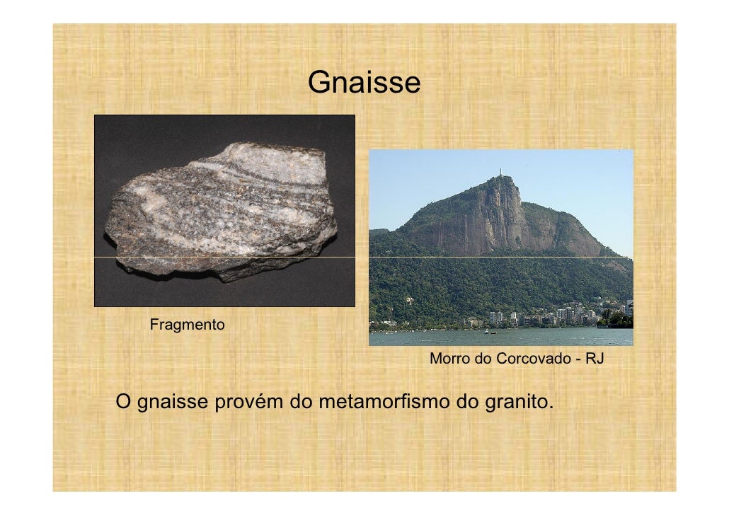 24. 24. Gnaisse Fragmento Morro do Corcovado - RJO gnaisse provém do metamorfismo do granito.