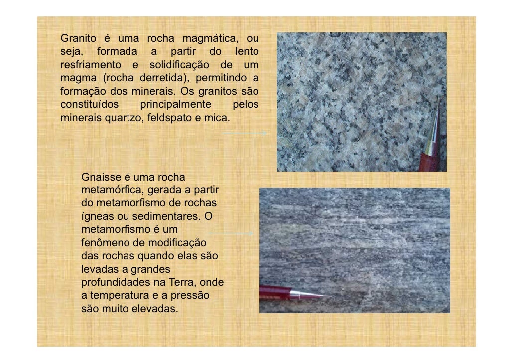 25. 25. Granito é uma rocha magmática, ouseja, formada a partir do lentoresfriamento e solidificação de ummagma (rocha derretida), permitindo aformação dos minerais. Os granitos sãoconstituídos principalmente pelosminerais quartzo, feldspato e mica. Gnaisse é uma rocha metamórfica, gerada a partir do metamorfismo de rochas ígneas ou sedimentares. O metamorfismo é um fenômeno de modificação das rochas quando elas são levadas a grandes profundidades na Terra, onde a temperatura e a pressão são muito elevadas.