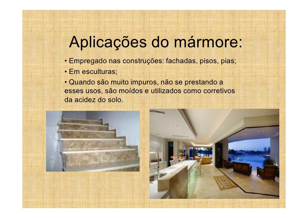 27. 27. Aplicações do mármore:• Empregado nas construções: fachadas, pisos, pias;• Em esculturas;• Quando são muito impuros, não se prestando aesses usos, são moídos e utilizados como corretivosda acidez do solo.