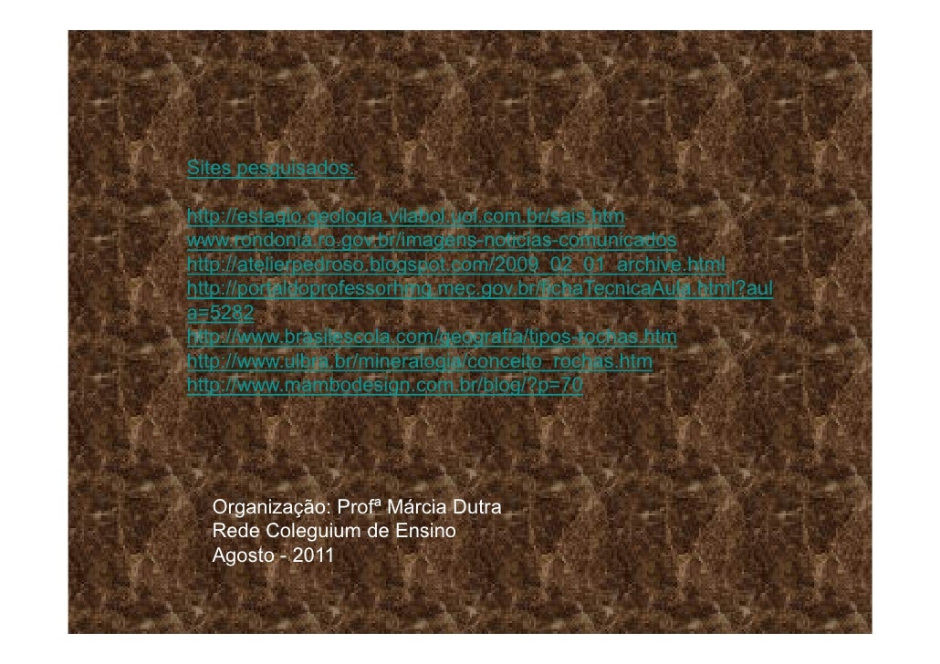29. 29. Sites pesquisados:http://estagio.geologia.vilabol.uol.com.br/sais.htmwww.rondonia.ro.gov.br/imagens-noticias-comunicadoshttp://atelierpedroso.blogspot.com/2009_02_01_archive.htmlhttp://portaldoprofessorhmg.mec.gov.br/fichaTecnicaAula.html?aula=5282http://www.brasilescola.com/geografia/tipos-rochas.htmhttp://www.ulbra.br/mineralogia/conceito_rochas.htmhttp://www.mambodesign.com.br/blog/?p=70 Organização: Profª Márcia Dutra Rede Coleguium de Ensino Agosto - 2011