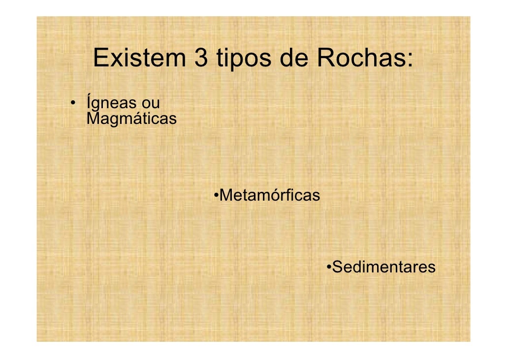 3. 3. Existem 3 tipos de Rochas:• Ígneas ou Magmáticas •Metamórficas •Sedimentares
