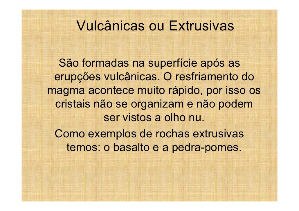 5. 5. Vulcânicas ou Extrusivas São formadas na superfície após as erupções vulcânicas. O resfriamento domagma acontece muito rápido, por isso os cristais não se organizam e não podem ser vistos a olho nu. Como exemplos de rochas extrusivas temos: o basalto e a pedra-pomes.