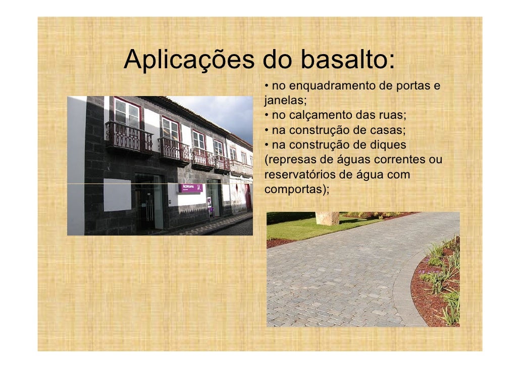 7. 7. Aplicações do basalto: • no enquadramento de portas e janelas; • no calçamento das ruas; • na construção de casas; • na construção de diques (represas de águas correntes ou reservatórios de água com comportas);