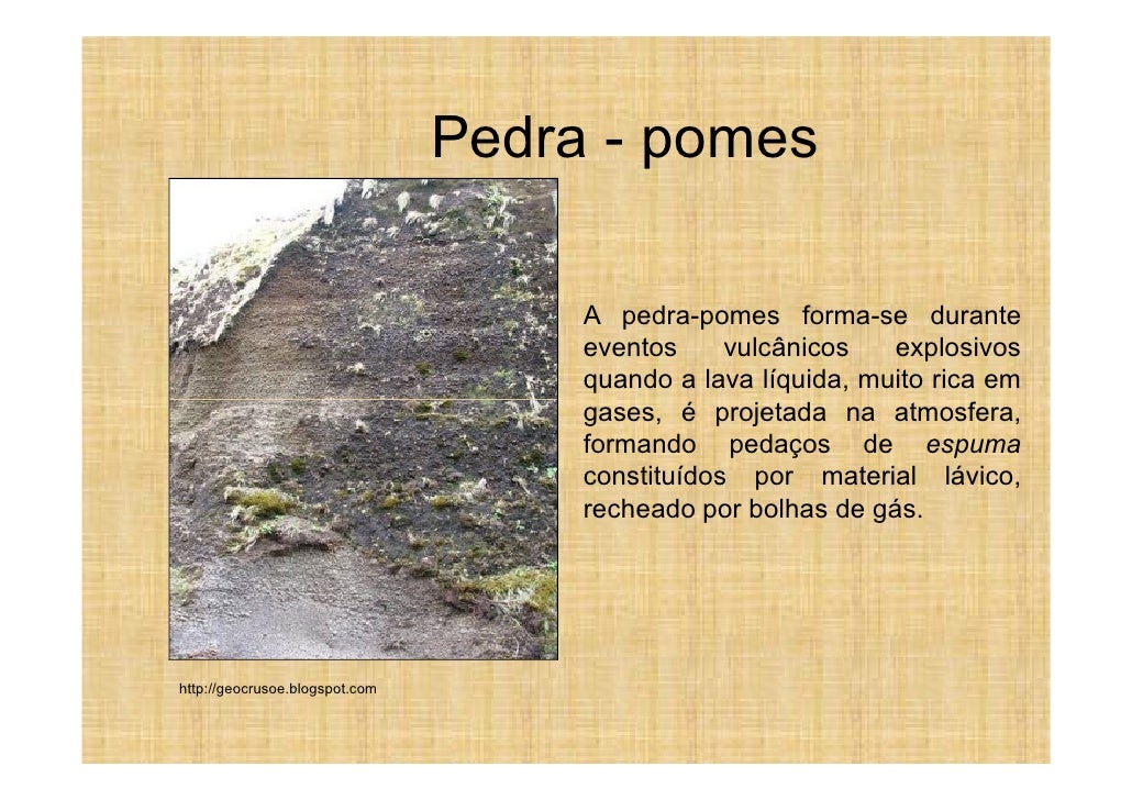 8. 8. Pedra - pomes A pedra-pomes forma-se durante eventos vulcânicos explosivos quando a lava líquida, muito rica em gases, é projetada na atmosfera, formando pedaços de espuma constituídos por material lávico, recheado por bolhas de gás.http://geocrusoe.blogspot.com