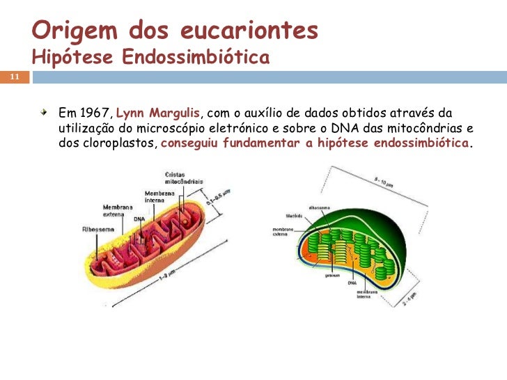 11. 11. Origem dos eucariontes Hipótese Endossimbiótica11 Em 1967, Lynn Margulis, com o auxílio de dados obtidos através da utilização do microscópio eletrónico e sobre o DNA das mitocôndrias e dos cloroplastos, conseguiu fundamentar a hipótese endossimbiótica.