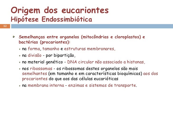 Origem dos eucariontes     Hipótese Endossimbiótica12       Semelhanças entre organelos (mitocôndrias e cloroplastos) e   ...