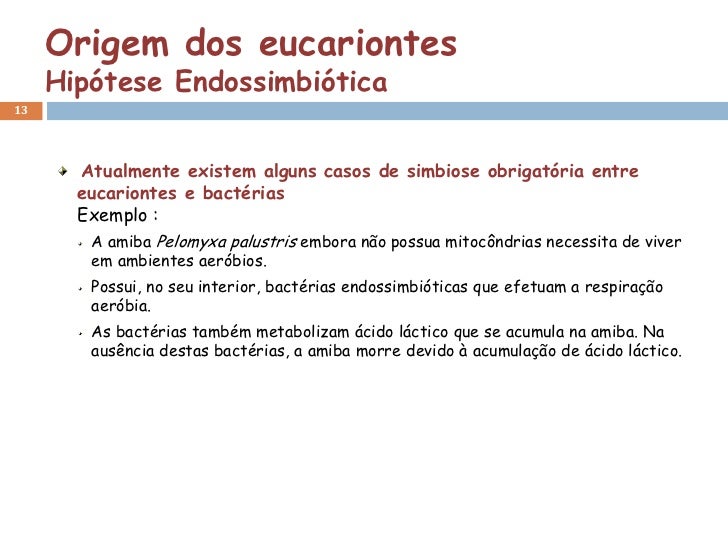 13. 13. Origem dos eucariontes Hipótese Endossimbiótica13 Atualmente existem alguns casos de simbiose obrigatória entre eucariontes e bactérias Exemplo : A amiba Pelomyxa palustris embora não possua mitocôndrias necessita de viver em ambientes aeróbios. Possui, no seu interior, bactérias endossimbióticas que efetuam a respiração aeróbia. As bactérias também metabolizam ácido láctico que se acumula na amiba. Na ausência destas bactérias, a amiba morre devido à acumulação de ácido láctico.