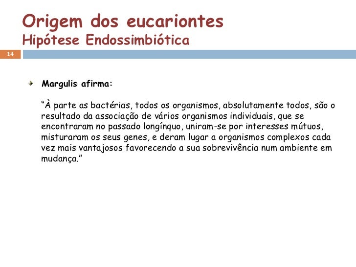 Origem dos eucariontes     Hipótese Endossimbiótica14       Margulis afirma:       “À parte as bactérias, todos os organis...