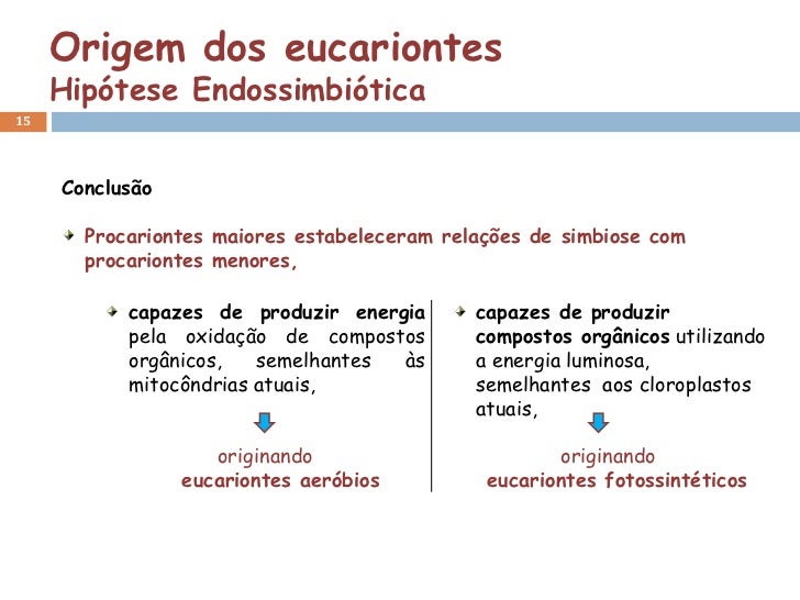 Origem dos eucariontes     Hipótese Endossimbiótica15     Conclusão       Procariontes maiores estabeleceram relações de s...