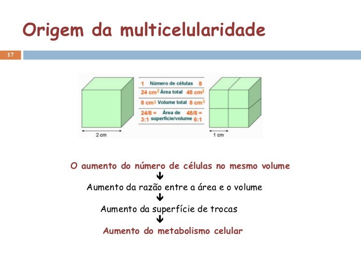 17. 17. Origem da multicelularidade17 O aumento do número de células no mesmo volume  Aumento da razão entre a área e o volume  Aumento da superfície de trocas  Aumento do metabolismo celular
