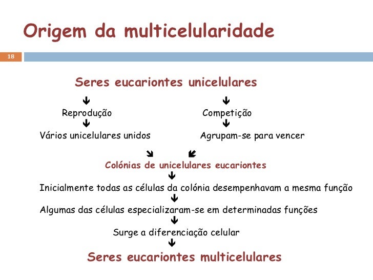 18. 18. Origem da multicelularidade18 Seres eucariontes unicelulares   Reprodução Competição   Vários unicelulares unidos Agrupam-se para vencer   Colónias de unicelulares eucariontes  Inicialmente todas as células da colónia desempenhavam a mesma função  Algumas das células especializaram-se em determinadas funções  Surge a diferenciação celular  Seres eucariontes multicelulares