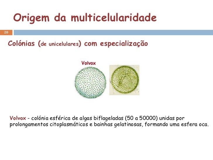 20. 20. Origem da multicelularidade20 Colónias (de unicelulares) com especialização Volvox - colónia esférica de algas biflageladas (50 a 50000) unidas por prolongamentos citoplasmáticos e bainhas gelatinosas, formando uma esfera oca.