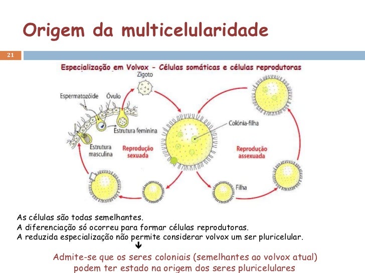 21. 21. Origem da multicelularidade21 As células são todas semelhantes. A diferenciação só ocorreu para formar células reprodutoras. A reduzida especialização não permite considerar volvox um ser pluricelular.  Admite-se que os seres coloniais (semelhantes ao volvox atual) podem ter estado na origem dos seres pluricelulares
