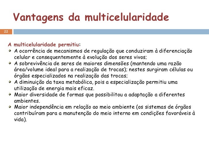 Vantagens da multicelularidade22 A multicelularidade permitiu:   A ocorrência de mecanismos de regulação que conduziram à ...