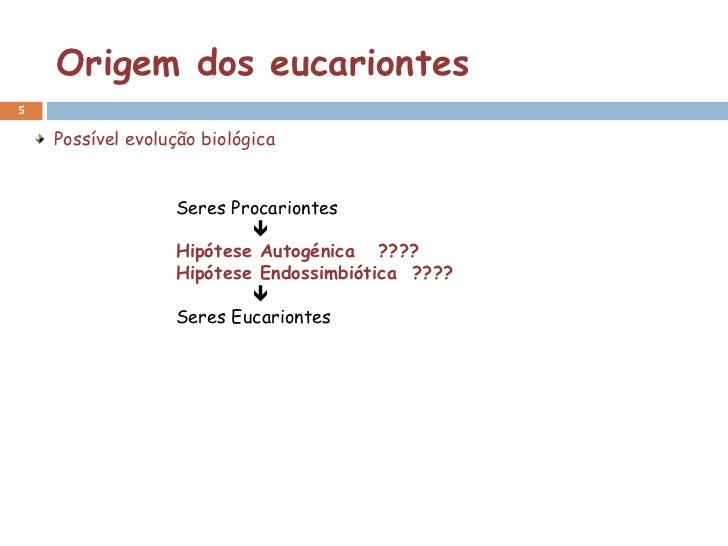 5. 5. Origem dos eucariontes5 Possível evolução biológica Seres Procariontes  Hipótese Autogénica ???? Hipótese Endossimbiótica ????  Seres Eucariontes