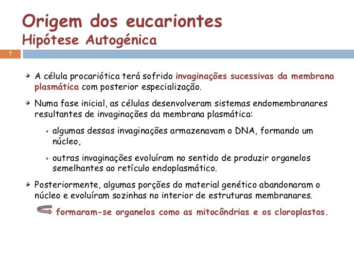 7. 7. Origem dos eucariontes Hipótese Autogénica7 A célula procariótica terá sofrido invaginações sucessivas da membrana plasmática com posterior especialização. Numa fase inicial, as células desenvolveram sistemas endomembranares resultantes de invaginações da membrana plasmática: algumas dessas invaginações armazenavam o DNA, formando um núcleo, outras invaginações evoluíram no sentido de produzir organelos semelhantes ao retículo endoplasmático. Posteriormente, algumas porções do material genético abandonaram o núcleo e evoluíram sozinhas no interior de estruturas membranares. formaram-se organelos como as mitocôndrias e os cloroplastos.
