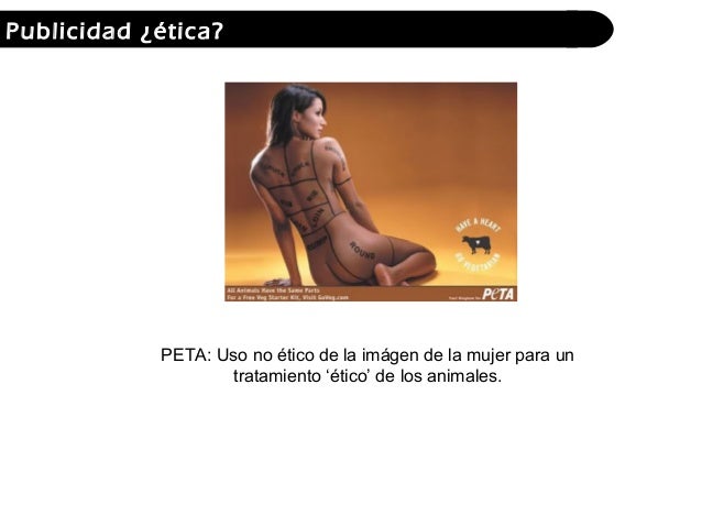2. 2. Publicidad ¿ética? PETA: Uso no ético de la imágen de la mujer para un tratamiento ‘ético’ de los animales.