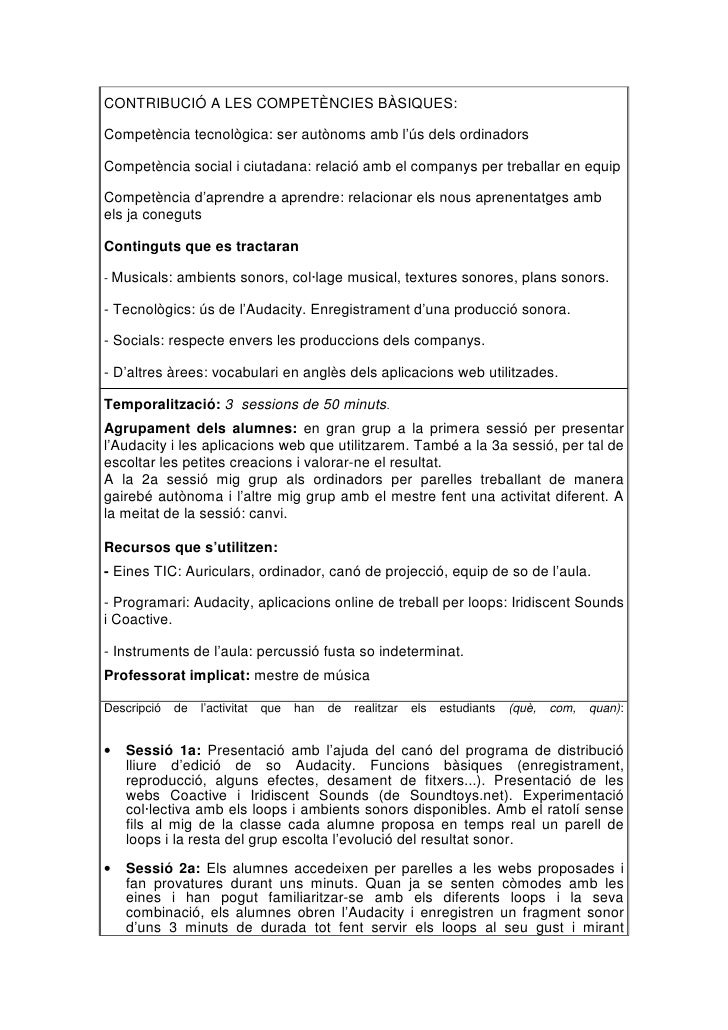 2. 2. CONTRIBUCIÓ A LES COMPETÈNCIES BÀSIQUES: Competència tecnològica: ser autònoms amb l’ús dels ordinadors Competència social i ciutadana: relació amb el companys per treballar en equip Competència d’aprendre a aprendre: relacionar els nous aprenentatges amb els ja coneguts Continguts que es tractaran - Musicals: ambients sonors, col·lage musical, textures sonores, plans sonors. - Tecnològics: ús de l’Audacity. Enregistrament d’una producció sonora. - Socials: respecte envers les produccions dels companys. - D’altres àrees: vocabulari en anglès dels aplicacions web utilitzades. Temporalització: 3 sessions de 50 minuts. Agrupament dels alumnes: en gran grup a la primera sessió per presentar l’Audacity i les aplicacions web que utilitzarem. També a la 3a sessió, per tal de escoltar les petites creacions i valorar-ne el resultat. A la 2a sessió mig grup als ordinadors per parelles treballant de manera gairebé autònoma i l’altre mig grup amb el mestre fent una activitat diferent. A la meitat de la sessió: canvi. Recursos que s’utilitzen: - Eines TIC: Auriculars, ordinador, canó de projecció, equip de so de l’aula. - Programari: Audacity, aplicacions online de treball per loops: Iridiscent Sounds i Coactive. - Instruments de l’aula: percussió fusta so indeterminat. Professorat implicat: mestre de música Descripció de l’activitat que han de realitzar els estudiants (què, com, quan): • Sessió 1a: Presentació amb l’ajuda del canó del programa de distribució lliure d’edició de so Audacity. Funcions bàsiques (enregistrament, reproducció, alguns efectes, desament de fitxers...). Presentació de les webs Coactive i Iridiscent Sounds (de Soundtoys.net). Experimentació col·lectiva amb els loops i ambients sonors disponibles. Amb el ratolí sense fils al mig de la classe cada alumne proposa en temps real un parell de loops i la resta del grup escolta l’evolució del resultat sonor. • Sessió 2a: Els alumnes accedeixen per parelles a les webs proposades i fan provatures durant uns minuts. Quan ja se senten còmodes amb les eines i han pogut familiaritzar-se amb els diferents loops i la seva combinació, els alumnes obren l’Audacity i enregistren un fragment sonor d’uns 3 minuts de durada tot fent servir els loops al seu gust i mirant