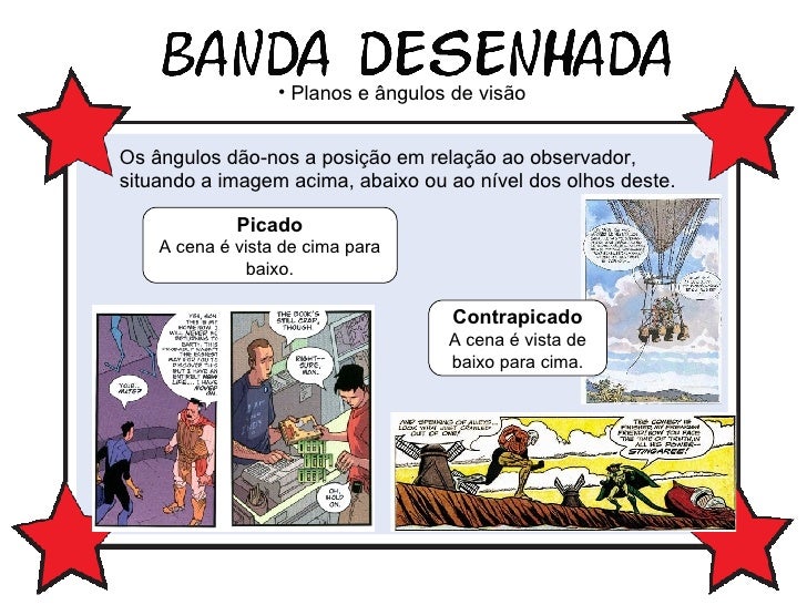 7. 8. <ul><li>Planos e ângulos de visão </li></ul>Plano geral descreve o ambiente onde se desenrola a história Plano médio Enquadra a personagem no quadro Plano de conjunto enquadra a personagem no cenário Os planos enquadram as personagens e os objectos na vinheta referem-se à distância, dando a sensação de afastamento ou aproximação.