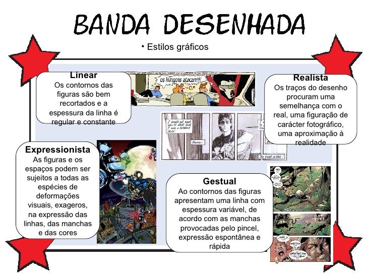10. 11. <ul><li>Estilos gráficos </li></ul>Linear Os contornos das figuras são bem recortados e a espessura da linha é regular e constante Realista Os traços do desenho procuram uma semelhança com o real, uma figuração de carácter fotográfico, uma aproximação à realidade Expressionista As figuras e os espaços podem ser sujeitos a todas as espécies de deformações visuais, exageros, na expressão das linhas, das manchas e das cores Gestual Ao contornos das figuras apresentam uma linha com espessura variável, de acordo com as manchas provocadas pelo pincel, expressão espontânea e rápida