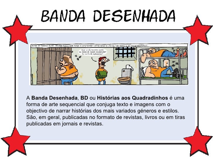 1. 2. A Banda Desenhada , BD ou Histórias aos Quadradinhos é uma forma de arte sequencial que conjuga texto e imagens com o objectivo de narrar histórias dos mais variados géneros e estilos. São, em geral, publicadas no formato de revistas, livros ou em tiras publicadas em jornais e revistas.