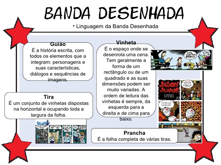 3. 4. Vinheta É o espaço onde se desenrola uma cena. Tem geralmente a forma de um rectângulo ou de um quadrado e as suas dimensões podem ser muito variadas. A ordem de leitura das vinhetas é sempre, da esquerda para a direita e de cima para baixo. Guião É a história escrita, com todos os elementos que a integram: personagens e suas características, diálogos e sequências de imagens. Tira É um conjunto de vinhetas dispostas na horizontal e ocupando toda a largura da folha. Prancha É a folha completa de várias tiras. <ul><li>Linguagem da Banda Desenhada </li></ul>